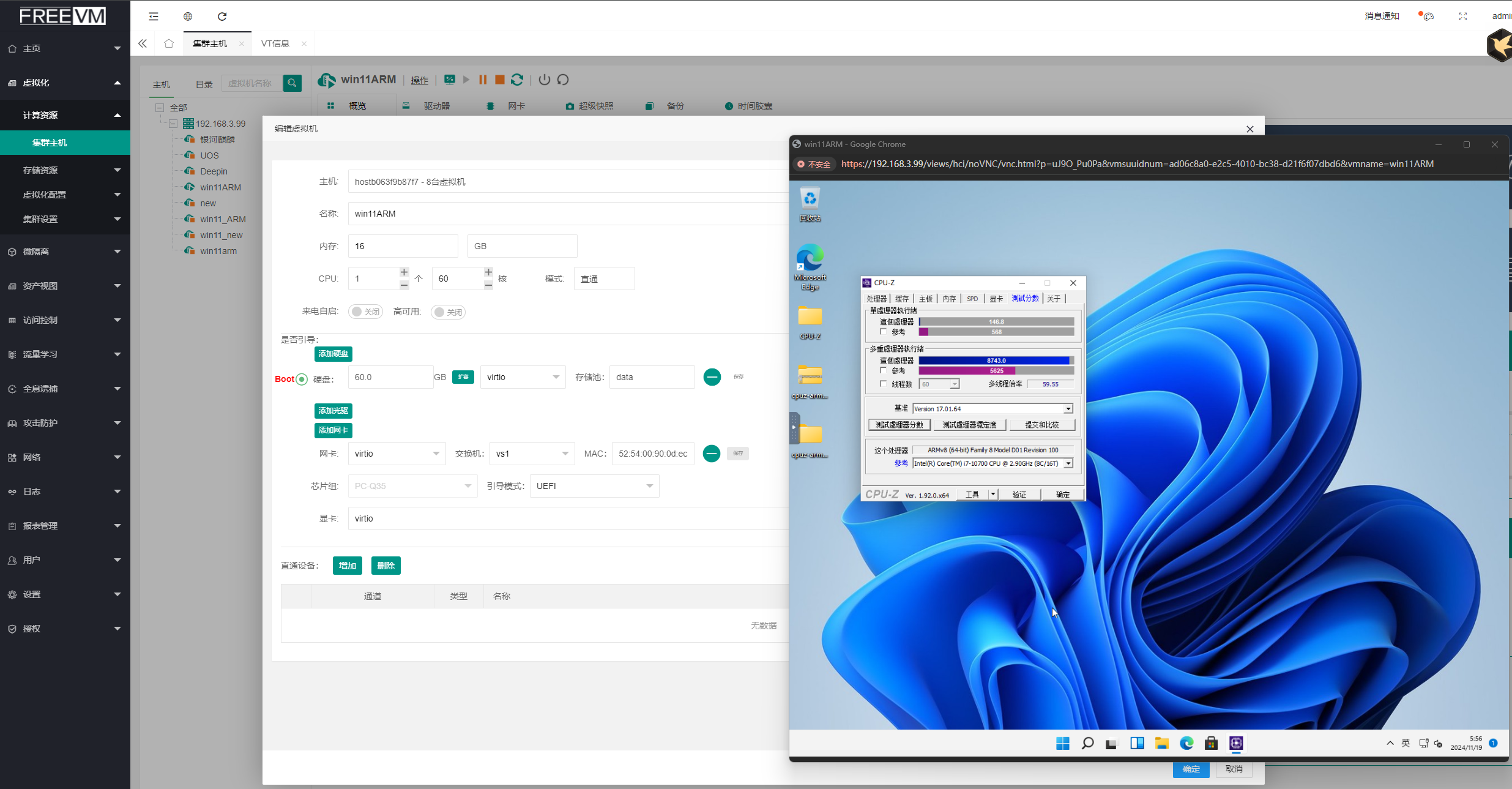 鲲鹏920 ARM处理器运行Win11,在FreeVM虚拟化平台CPUZ跑分近万
