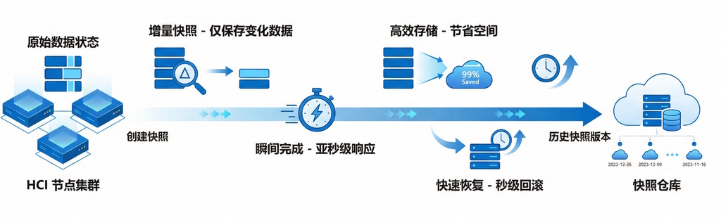 内置的快照功能为增量快照,快照之间对存储只消耗增量部分,快照几乎瞬间完成,节省快照等待时间。