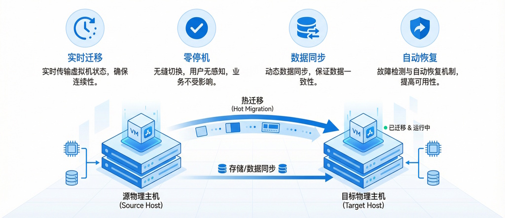 内置的热迁移功能支持虚拟机在不关机的情况下,从一个节点迁移到另外一个节点,业务运行不间断。